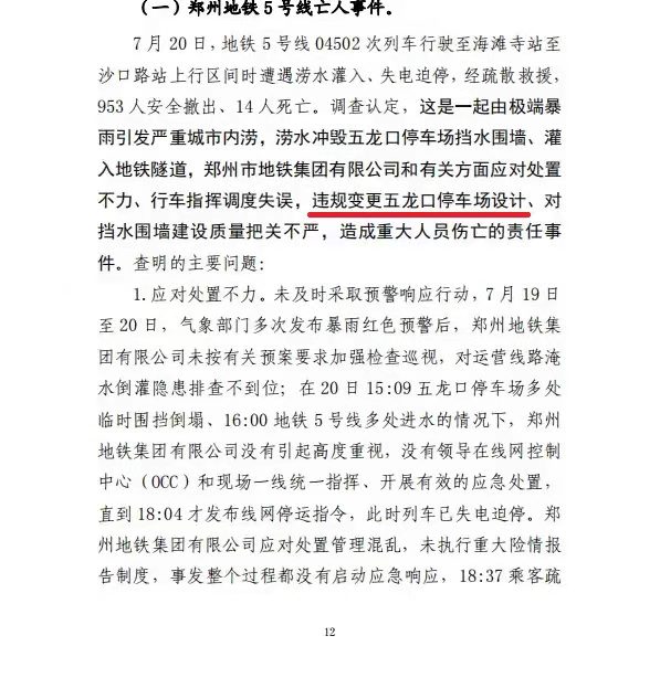 调查认定:这是一起由极端暴雨引发严重城市内涝,涝水冲毁停车场挡水围墙、灌入地铁隧道,造成14人死亡。郑州地铁集团有限公司擅自变更设计,未上报发改委审核,设计单位违规向施工单位提供白图,郑州地铁集团有限公司违规同意采用白图施工,施工单位违规采用白图施工,质监站未发现问题和缺陷,并出具了工程质量验收合格的监督意见。郑州市雨水管道仅2400余公里,196.3亿海绵投资,实际与海绵城市相关的仅占32%,用于景观、绿化等占近56%。