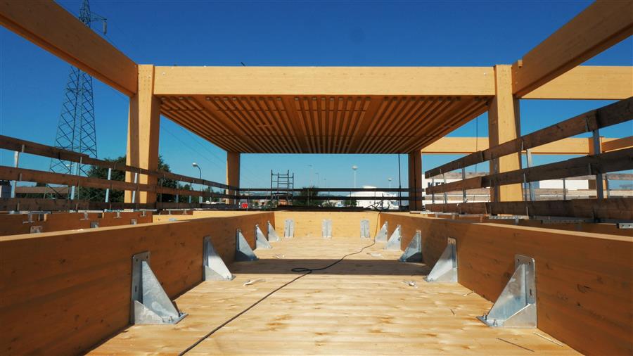 承重结构采用层压木材的预制构件,天花设置一系列约12 x 12 厘米的板条。通透的空间和木制结构清晰地展现在眼前,演绎木材的温暖美观。全玻璃的幕墙延伸至每个楼层,使自然光得以穿透建筑深处,创造高质量的室内环境。