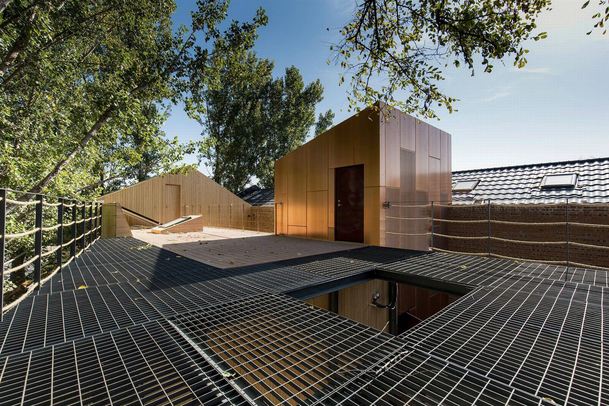 大面积的天窗和风塔为室内采光与通风提供了充足的补给,创造了冬暖夏凉的人居环境,郁郁葱葱的杨树透过天窗向室内洒下斑驳的倒影,建筑与自然自成画卷。